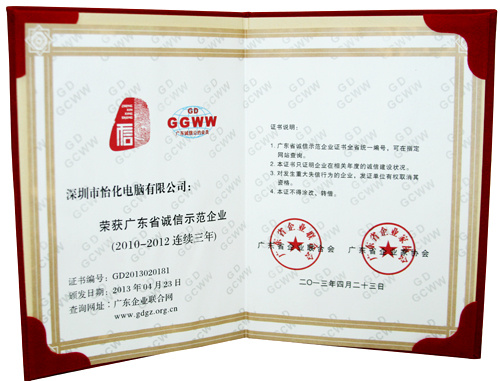 怡化連續(xù)三年榮獲廣東省誠信示范企業(yè)